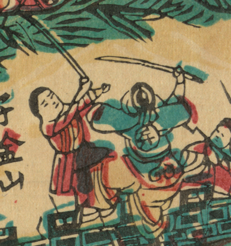 5/9 我再次试了试电子版画的原理,即通过python脚本把image的相似的颜色区域整合然后分别输出出来。比如下图版画有红蓝黄黑四色,其中两个小人分别穿红色和蓝色衣服,但是我们可以看到由于不同颜色需要分别印刷的缘故,导致了极大的误差。并且我们也可以注意到画面的用线偏硬朗,人物的肖像画呈现明显的简化。以上的都是属于木刻版画的独特味道。